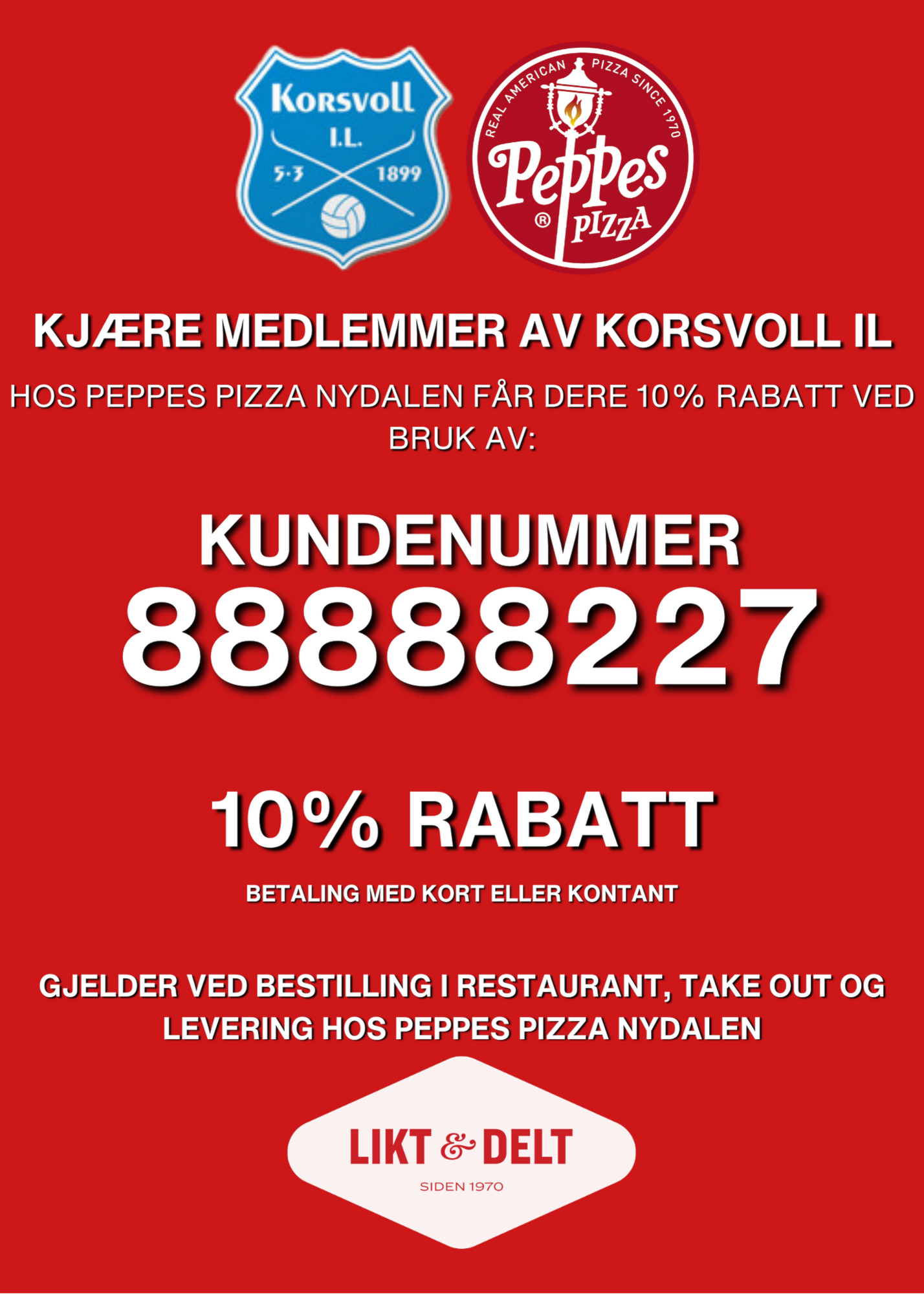 Avtalen gir oss 10% rabatt ved bestilling i restaurant, take out og levering.